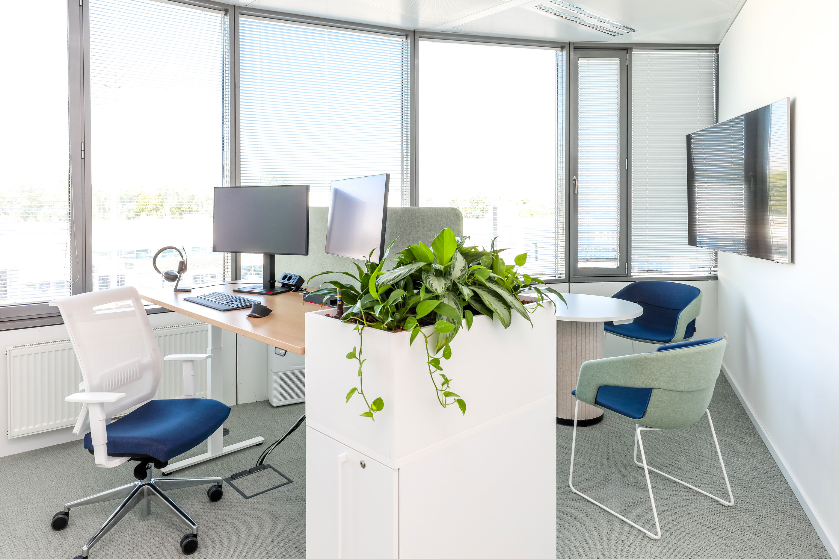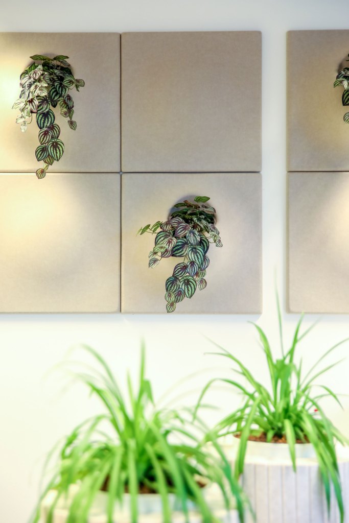 Besondere Aufmerksamkeit galt der Akustik im gesamten Büro. Bei der Wahl der Möbel und des Bodens wurde darauf geachtet, dass diese nicht nur ästhetischen, sondern auch funktionalen Anforderungen gerecht werden. Die praktischen Wandaufhängungen und Stehsäulen, die zur Unterbringung von Begrünungselementen dienen, sind nicht nur dekorativ, sondern bestehen auch aus lärmabsorbierenden Materialien. Auch die Stehtische und die Trennwände bei den Einzelarbeitsplätzen tragen zur Lärmminderung bei.