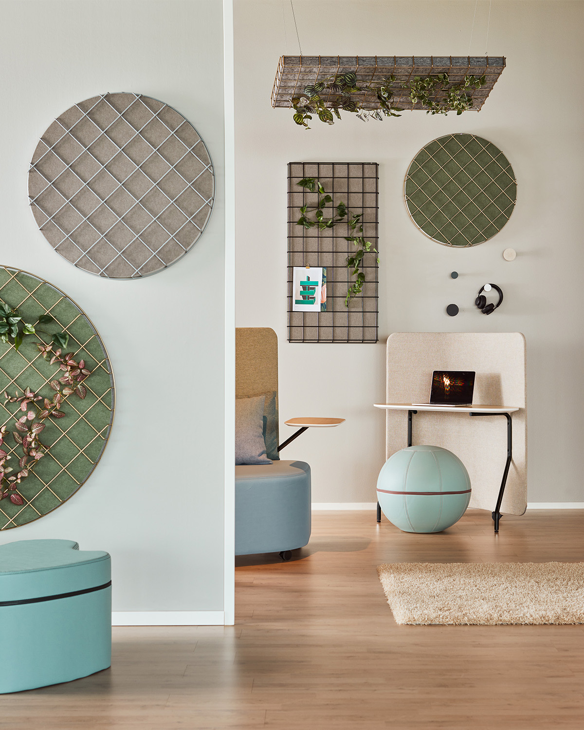 Off The Grid ist ein runder Drahtrahmen für die Wandmontage. Kombinieren Sie mit dem Off the Grid-Absorber in bezogenem oder unbehandeltem EcoSUND. Ergänzen Sie Pflanzengirlanden, um Ihrem Raum einen echten Eyecatcher zu geben.